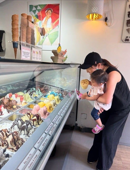 続けて「この後、ばーちゃんが手遊びしながら歌を唄ったりしてみたら…だるまさんが転んだみたいに少しづつ、少しづつ近づいて来ましたが近づいて来たらもう、ばーちゃんの勝ち 金にものを言わせてアイスを買いに連れて行きました~」と外出したことを報告。「すーちゃん。どれ食べたい?ばーちゃんが、ここのアイス端~端まで買ってやろうか!?そんな勢いでございます」とアイスを見る自身と寿々ちゃんの写真を公開し「すーちゃんの心はバッチリ掴めました」とつづった。