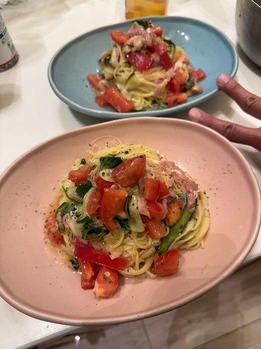 この日、杉浦は「リクエスト続きで、ヘビロテで作ってるパスタ」と切り出し「まだまだ暑いから冷製パスタが食欲出るよね」と作った料理の写真を公開。「生ハムとトマトの冷製パスタ、ズッキーニ入り」と紹介し「暑さを乗り越えよ~!!」とつづった。