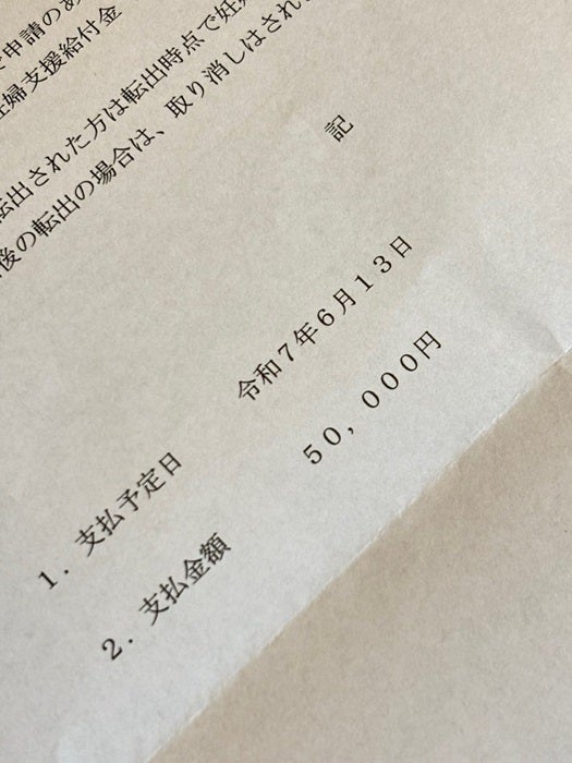 続けて「5万円しかもポイントとかクーポンではなく現金なのは有り難い!!」とコメント。「無痛分娩費用の足しにしよう」と使い道を明かし「こういうのはありがたい」とつづり、ブログをしめくくった。