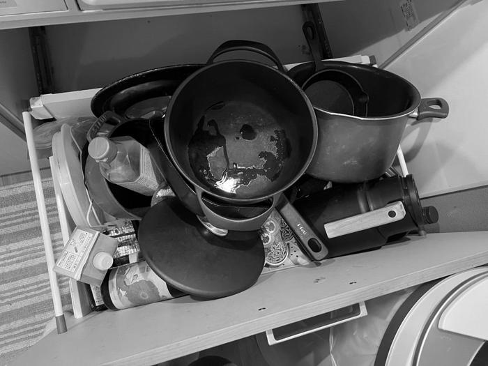 この日、クロは「なんとなく、、、、白黒にしてみたけれど…」と切り出し、モノトーン加工したコンロ下収納の写真を公開。「よくある丁寧な立てる?収納みたいなんしてる時もあった」と明かすも、乱雑に収納された様子に「気づけばこうなっちゃうね、、、」とつづった。