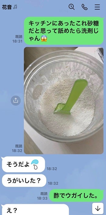 続けて「やばいと思ってとりあえず近くに」「ピクルス用の酢があったから何故か酢でウガイをした」と述べ「でも口の中に泡が」と当時の状況を説明。「すぐに花音にLINEをした」とやり取りの様子をLINEのスクリーンショットで公開し「俺のこんな間抜け話ブログに書かなくてもいいじゃん」とお茶目につづり、ブログを締めくくった。