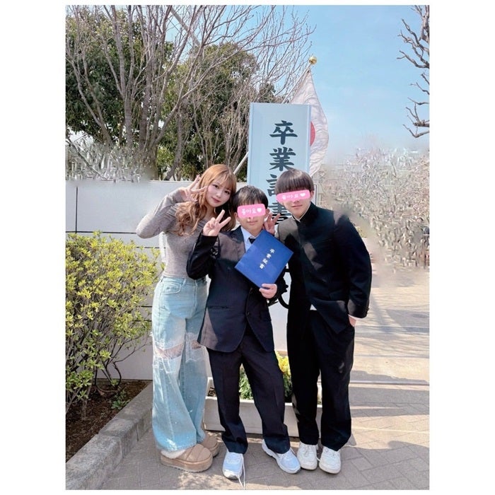 続けて「式終わりに希空と学校帰りのせいあが来てくれて三人でパシャリ」と子ども達の3ショットを公開し「ちなみに今日ソラが着たスーツはせいあが小学校卒業式に着たスーツです」と説明。最後に「4月からは中学生!!せいあが3年、ソラが1年生になります」と報告し、新学期への期待を「楽しみだね」とつづり、ブログを締めくくった。