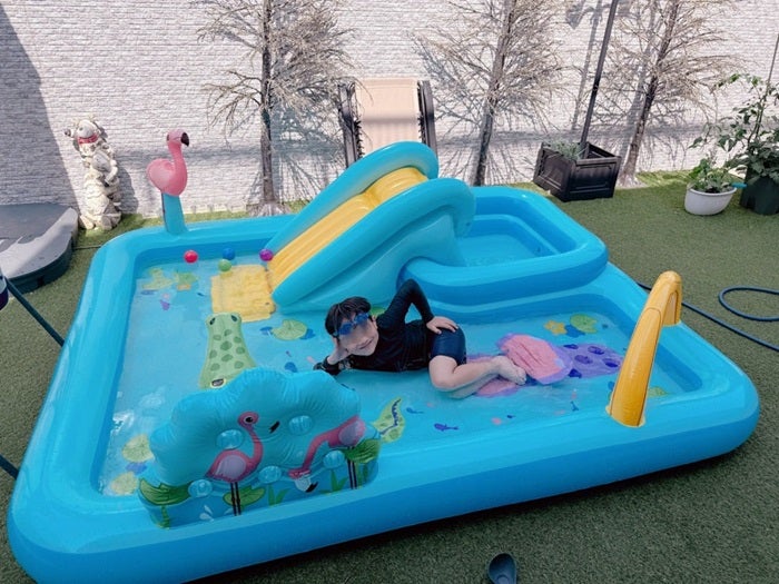 続けて、幸空くんが汗だくで帰宅したことを報告し、気温について「そりゃそーよ31度て夏やん」とコメント。「って事でまだ少し早いけどあまりの暑さに水遊びと言う事で浅いプールにぬるま湯ためてプール??水遊び??始めました」とプールで遊ぶ幸空くんの姿を公開し「これ真夏どーなっちゃうの!?怖すぎる」とつづり、ブログを締めくくった。