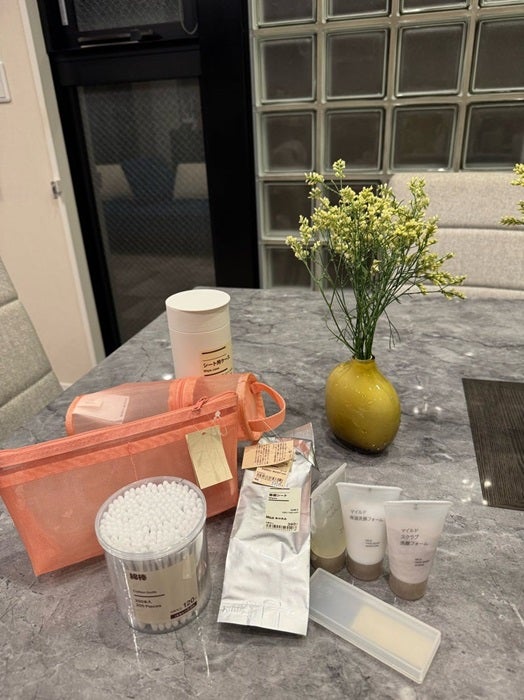 続けて「綿棒はこちらのケースに入れます。どちらも無印で購入」と綿棒ケースを紹介。「洗顔料。コンパクトな大きさのもの。泊まりなど持ち歩きに超便利」と洗顔料についても言及した。