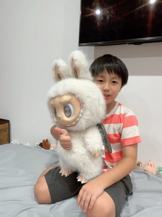 続けて「特大のラブブの仲間のZIMOMOをプレゼント~」とプレゼントを手にする息子の姿を公開。「アレクには値段言ってないけどめちゃくちゃ高かった」と明かした。