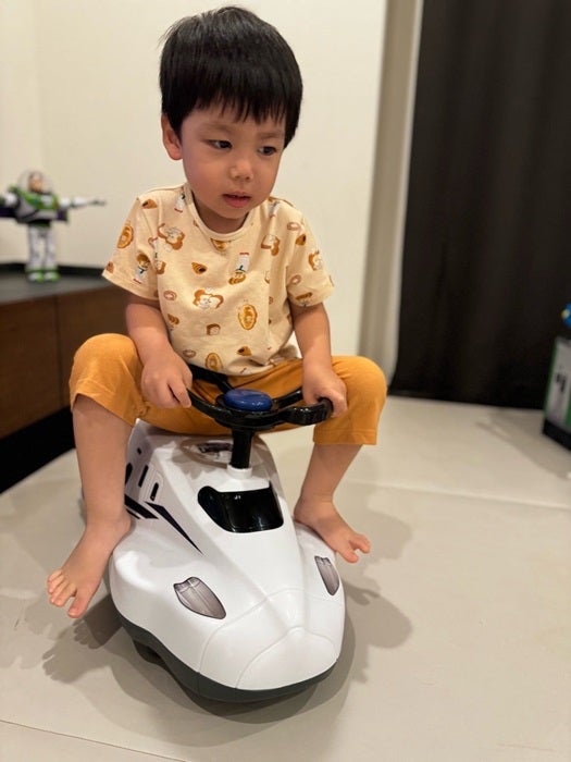 続けて「ハンドルを左右に動かすと前進するみたいなので地面が固いところで、やらせてみたいと思います」と述べ「改めて凄いプレゼントをありがとうございました」と新幹線の乗用玩具に乗る息子の写真とともにコメント。最後に「これから点鼻薬をして、鼻が詰まってる方を上に横向きになって寝ます」と報告し「今日も1日、ありがとうございました」とつづり、ブログを締めくくった。