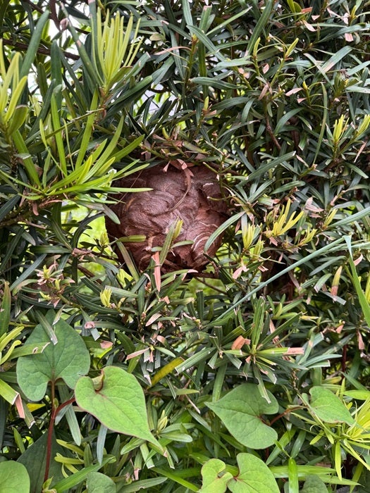 続けて「そこへご近所の方に『これ何かわかる?』と声をかけられたのですが何これ???木の実かと思ったけどまさか蜂の巣?」と写真を公開。「絶句と鳥肌 後退り そんなに怖がらなくてもと言われましたがめろせなが刺されたら大変だもの...」と述べ「ですが、蜂は見当たりません 空なの?」とつづった。