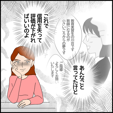 赴任直後から自慢話で生徒の反感を買い、ボイコットを招いた非常勤講師・岡田。妊娠休業明けも冷ややかな視線は変わらず、人気実習生・川合への嫉妬を募らせる。校長に「ハラスメント」と叱責され、さらにコネ採用の事実を突き付けられてプライドは崩壊。噂は教師陣にも広まり孤立するなか、岡田は川合が男子生徒に告白される場面を目撃し、嫉妬心から「あの2人は不適切な関係だ」と事実をねじ曲げて校長へ告発する。校長から呼び出された川合は、事実無根の追及に困惑するのだった。