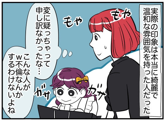 矢部マリアと会う調整を義妹にお願いしたところ、どうやら夫はその調整に主人公を関わらせたくない様子。そして週末、駅前のファミレスで会うことになったのだが、なんと彼女の家族は来ないという…