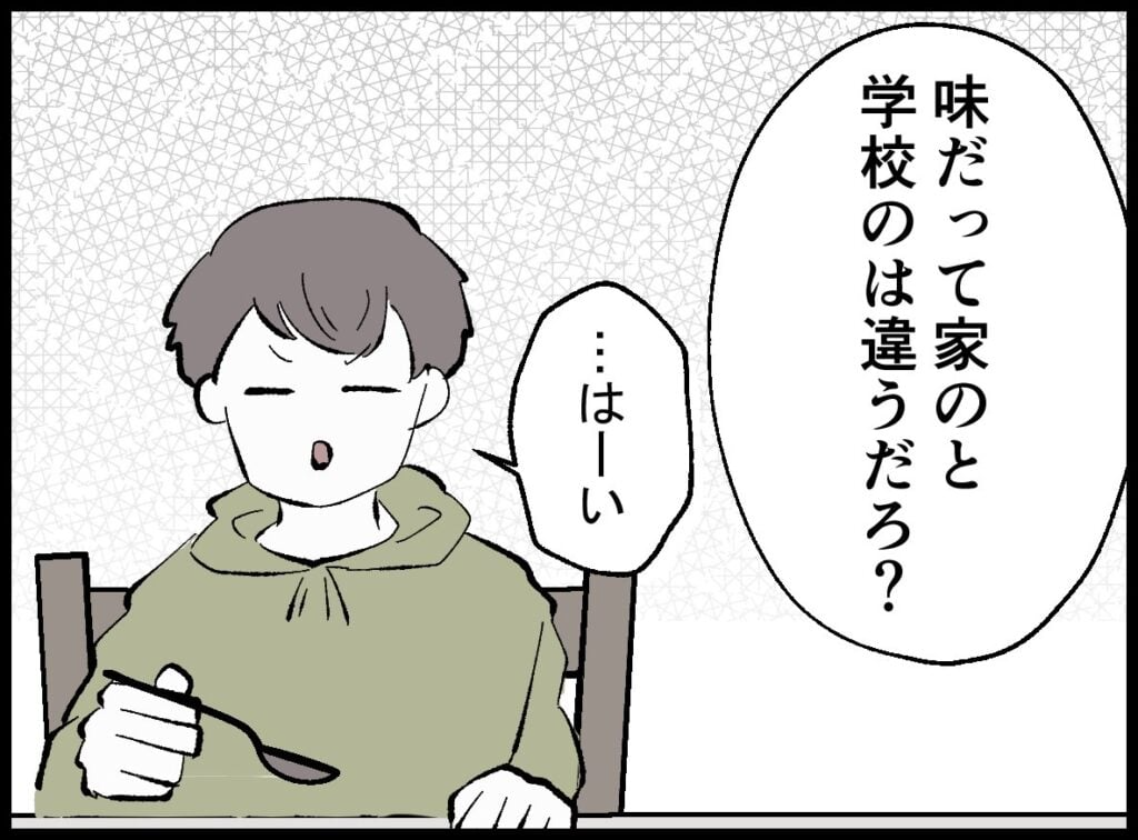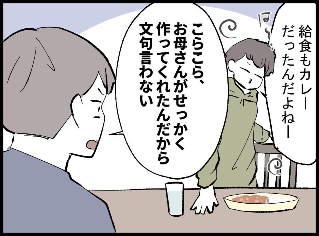 夕飯のメニューに文句を言う息子に対し、「お母さんがせっかく作ってくれたんだから」と父親らしくたしなめる夫。