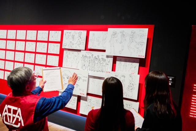 辻:こちらに展示してあるのは、TVシリーズの『新世紀エヴァンゲリオン』の制作前に、キャラクターの統一を図るために作られた設定資料です。アニメーションですと、必ずこういった資料を作るんですけども、それぞれのキャラクターとか、登場人物の服とか、そういった細かい仕様を絵に落として決めていきます。そして、この資料が現場のスタッフに配られまして、これを見ながらみんな作業していく、そういうものですね。