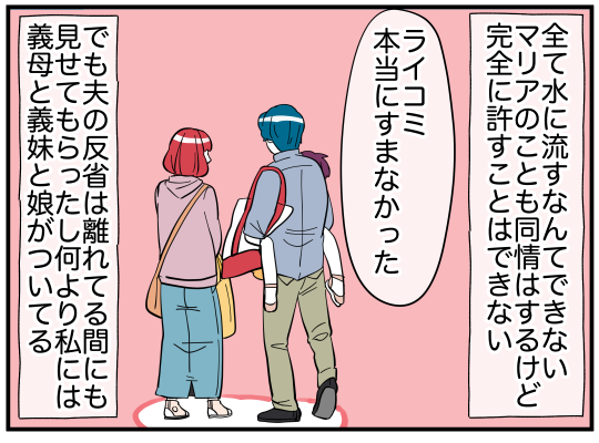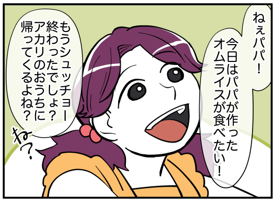 義実家に預けていた娘とともに帰宅した主人公。夫は入れ違いで義実家へ向かったようで、その姿はなかった。パパがいないことをいつまでもごまかすことはできない。なにより自分はどうしたいのか…気持ちを整理しはじめる。