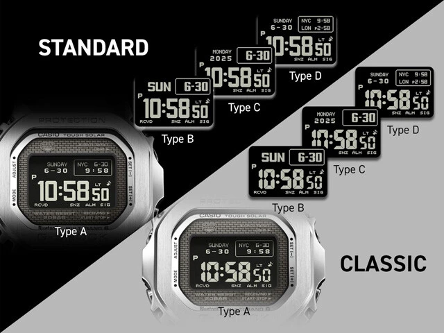 超定番の5000シリーズのデザインで外装はフルメタル仕様。さらに、デジタル表示部にはMIP液晶を採用した最新モデル。MIP液晶は日差しの強い屋外でも視認性が良く、高精細表示でウオッチフェースをさまざまなフォントに切り替え可能。ベゼルとセンターケースを上下で連結した独自構造で、強靱な耐衝撃性能も踏襲!