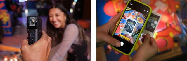 本体背面にはモニターが搭載され、「ジダイヤル」を使ってレトロなエフェクトの選択やコントラストなどの調整もOK。ショート動画の撮影がはかどる注目の新商品!