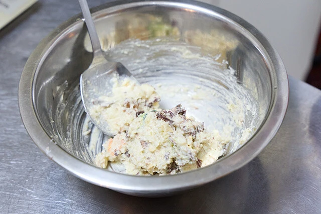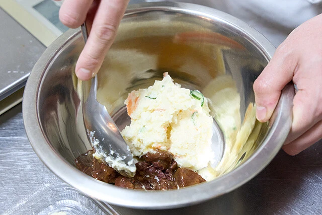 ①ボウルに市販のポテトサラダと8割くらいの量のクジラの大和煮を入れる(残りは盛りつけ時の飾り用に使う)