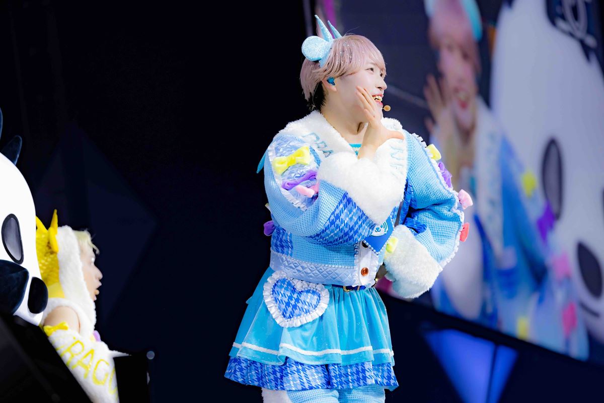 キャラクター・パンダドラゴンちゃんがステージに登場し、「ぱんぱかぱんだ」「ちゅるちゅるらぶ」「ダイスキ☆シンドローム」では、メンバーと息の合ったダンスを披露。パンダドラゴンちゃんが実際に登場したのは初めてのようで、あまりの可愛さと自然とこなす完璧なダンスに会場中が釘付けになる。可愛いが連呼されるなか、なぎに連れられてパンダドラゴンちゃんはここで退場。この流れから新たな衣装も披露され、さらに会場を華やかに彩り、「今日は5人で披露します」と、なぎ、なるき、ぱっちのユニット曲「Ring!Ding!Dong!」へ。武道館だからこその特別な演出はここでも飛び出して玉手箱のようなライブは続いていく。