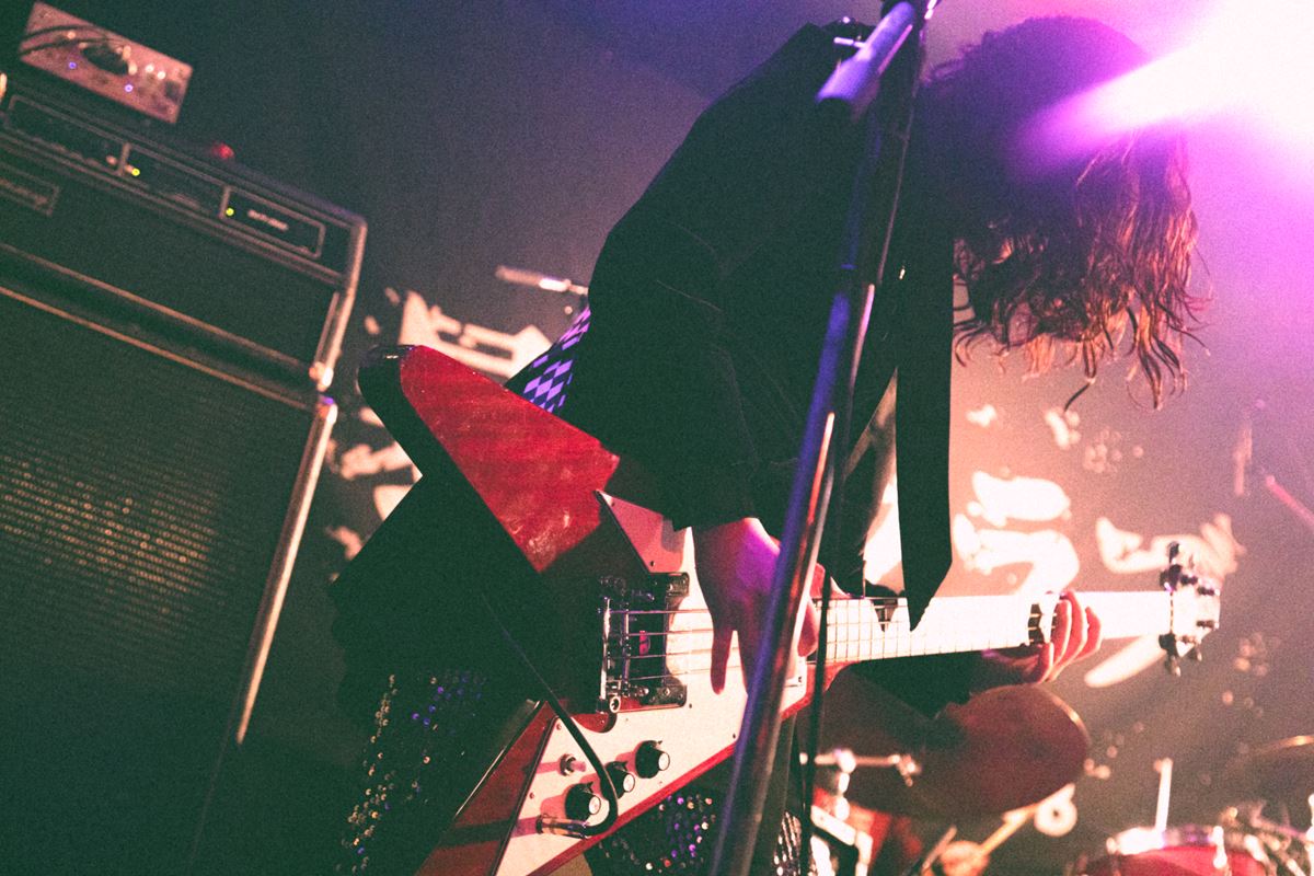 最新アルバム『暴動遊戯』のオープニング「ドライブ・ミー・トゥ・ザ・ムーン」からショーがはじまった。平均年令22歳、煌びやかな衣裳とメイクから放つロックンロールのフェロモンがたちこめる。続けてインディーデビュー7インチシングル「暴動クラブのテーマ」、メジャーデビューアルバムから「ラブジェネレーター」「ダリア」へ。チューニングのインターバルを挟み、BSよしもとでライブ映像をよく見た「くだらない時代に唾を吐け」から「Feel So Good?」まで一気に4曲、激しくも狂おしい渦を巻き起こした。