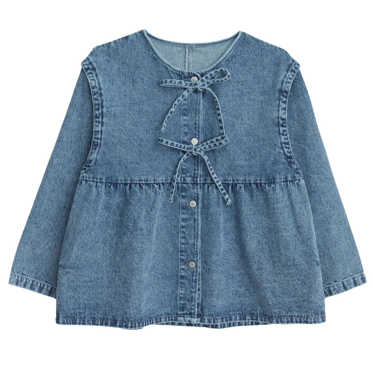 リボンとペプラムシルエットで甘さをプラスしたノーカラーデニムジャケット。