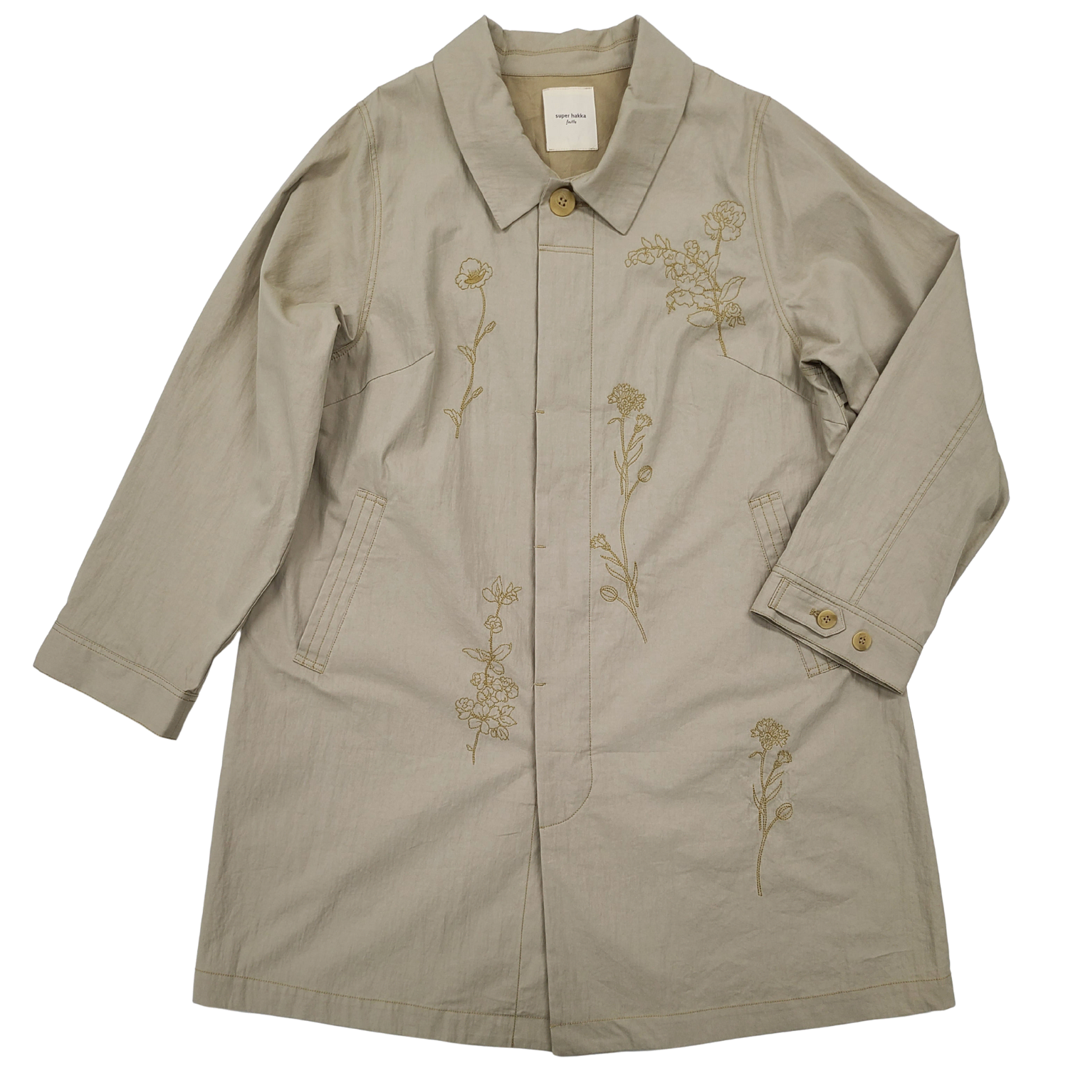 同系色の刺繍が施されたツイル素材のミドル丈コート
