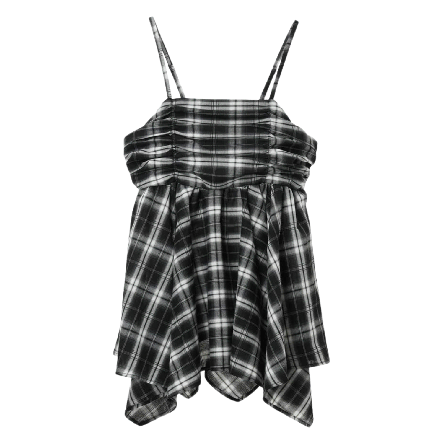 合わせやすい万能なチェック柄のシャーリングキャミソール