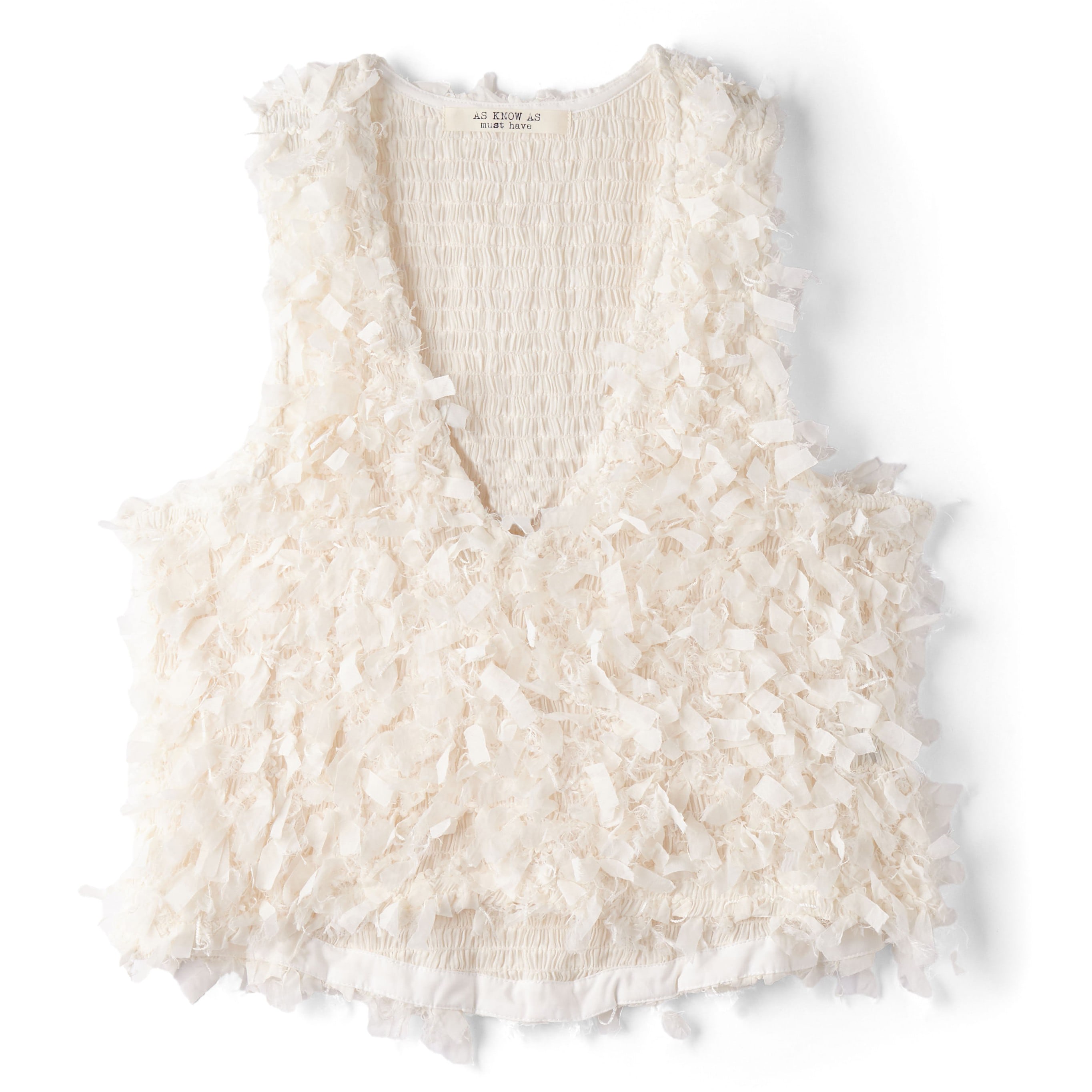 シャーリングチュール素材に、リボン状の生地をふんだんにフリンジのようにあしらい、