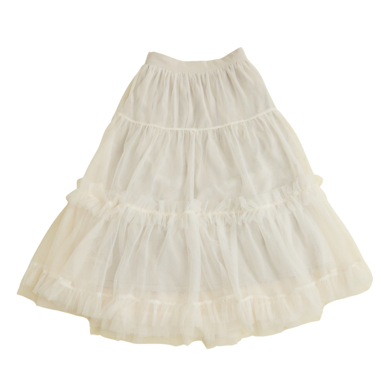 軽やかなチュール素材で、程よく透け感のあるフリルティアードスカート。