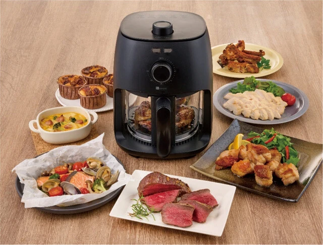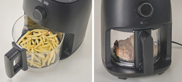熱風を循環させて、揚げ物の調理や再加熱で大活躍するノンフライヤー調理器。既存の製品では調理時に食材の入ったトレーを取り出して揚げ加減をチェックする必要がありましたが、本製品はガラス製のトレーを採用して外から揚げ加減の確認が可能。