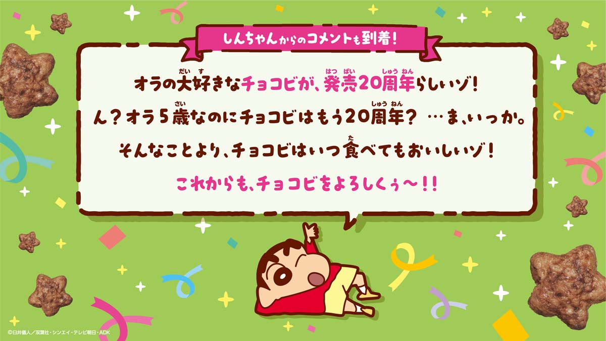 東ハトとバンダイが2006年から共同開発している、『クレヨンしんちゃん』に登場するしんのすけの大好物のお菓子を再現した「チョコビ」が発売20周年を迎える。
