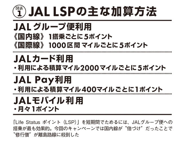 「今回の修行僧たちの目的は、マイルとは別に搭乗実績で得られる『ステイタス(優遇資格)』です。現在、JALの制度は生涯実績の『Life Status プログラム(LSP)』(図表①)と、1年ごとの実績で決まる『FLY ON プログラム(FOP)』の2本立てですが、多良間便はその両方の獲得に極めて好都合なのです」