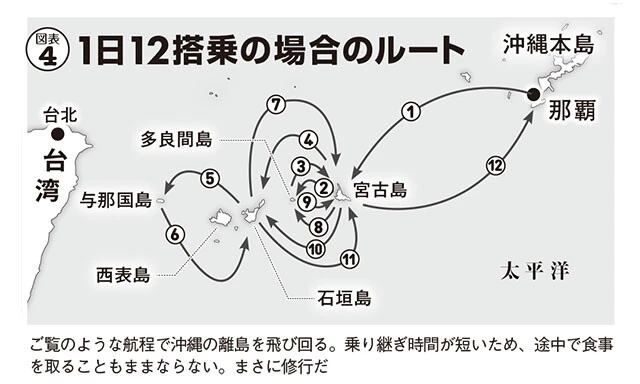 つまり、空港の外へ一歩も出ず、一度降りた後再び同じ機体に乗り続けるだけで実績が爆発的に積み上がる。例えば那覇を起点に島々を巡れば1日12回もの搭乗が可能(図表③④)で、一気に120ポイントを稼げます。これは年間120回搭乗で最高峰ランクとなる『FLY ON プログラム』の回数稼ぎとしても、驚異的な効率です。